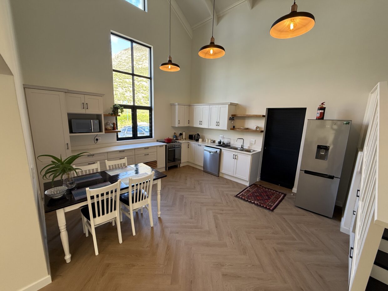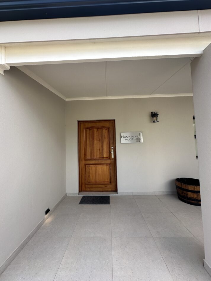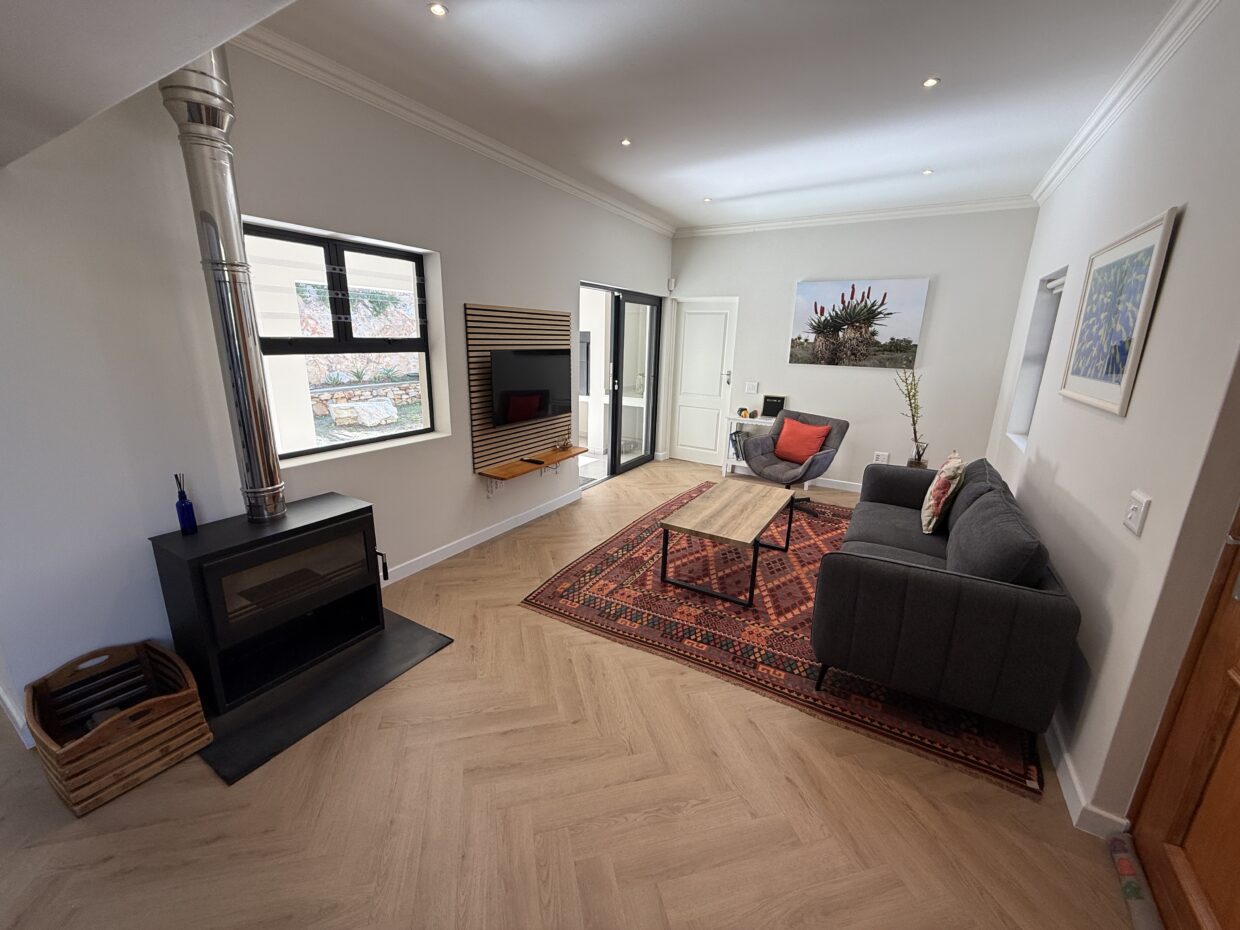 Mountain Aloe is the larger of the two cottages, offering comfort, space, and modern convenience. Perfect for up to four guests, it features a tranquil bedroom with a queen-size bed and French doors opening into the garden. The bathroom is fitted with a walk-in shower, washbasin, and toilet, and comes stocked with all linen, bath towels, and indulgent locally produced soaps. A hairdryer and make-up removal cloths are also provided. The open-plan living area is designed for relaxation and ease, boasting a fully equipped kitchen with stove, oven, microwave, fridge-freezer, cutlery, crockery, a 4-seater dining table, and even a dishwasher. From here, the lounge invites you to unwind with comfortable seating, a wall-mounted smart TV, and a cozy fireplace — perfect for winter evenings. Free Wi-Fi is available throughout the cottage. Sliding doors lead out to a deep furnished veranda, complete with a braai area overlooking an indigenous garden — the ideal spot to soak up the peaceful surroundings. Upstairs, the spacious loft doubles as a workstation and additional sleeping area, with a desk, ample office space, and a queen-size bed, which can be separated into two single beds to accommodate extra guests. Whether you’re here to relax, recharge, or mix leisure with a little work, Mountain Aloe is the perfect countryside escape.