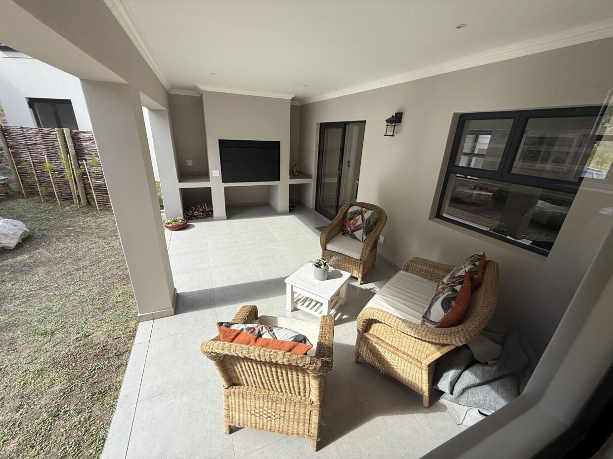 Cozy veranda, with outdoor braai and comfortable furnishings.